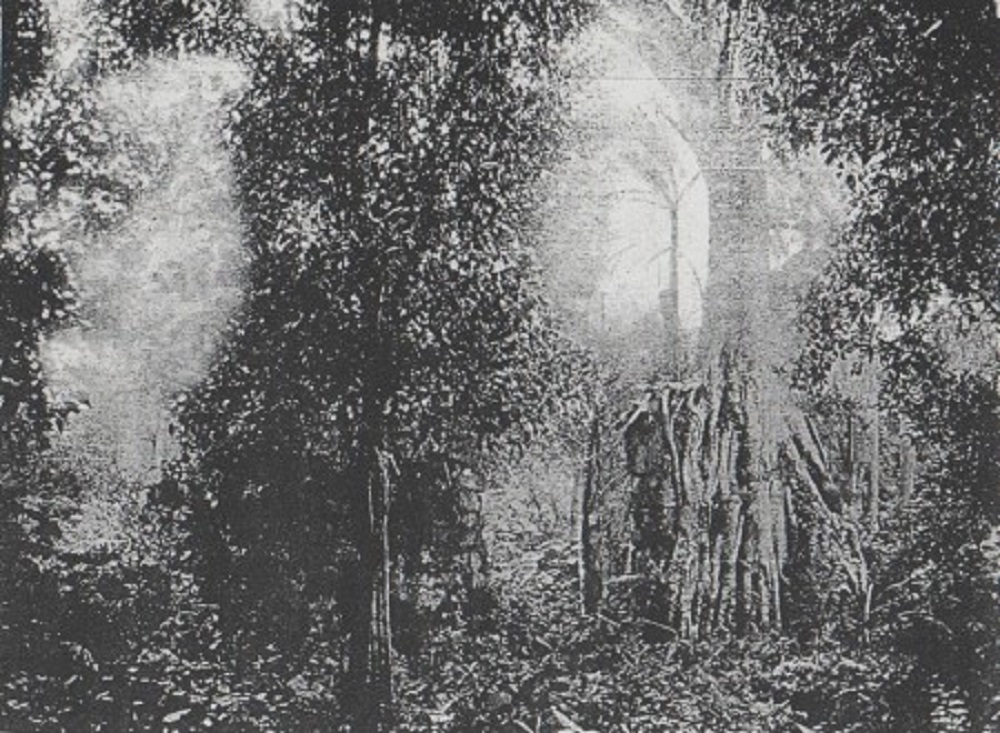 Una imagen histórica de los restos de los que fue la antigua Misión Jesuítica de Apóstoles, cubierta por una espesa maleza, árboles y monte.