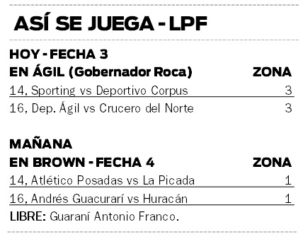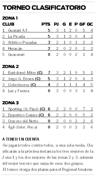 Por su parte, el domingo, en cancha del club Jorge Gibson Brown, se jugará la cuarta fecha de la zona 1, en donde todos tienen chances de clasificar. El puntapié inicial será a las 14 con el encuentro entre Atlético Posadas y La Picada; mientras que desde las 16, lo harán Andrés Guacuarí y Huracán. Guaraní, que espera expectante, tendrá jornada libre.
