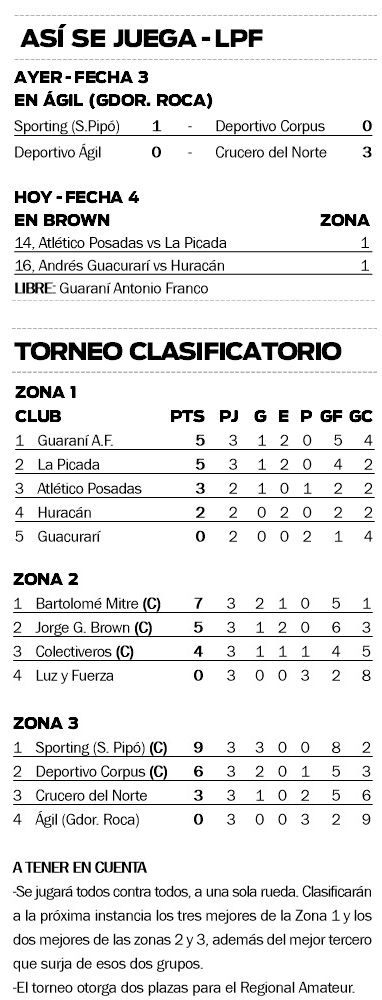 Uno de esos casos es el de La Picada que, a partir de las 14, se enfrentará a Atlético Posadas. El Tren del Oeste es uno de los líderes del grupo junto a Guaraní con cinco unidades, pero como en el último capítulo quedará libre, hoy tendrá su última oportunidad de clasificar por cuenta propia y no pasar a depender de otros resultados.