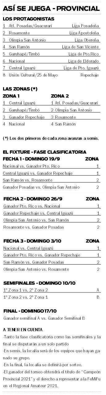 Con sus pasajes asegurados, Nacional y Rosamonte se suman a los ya clasificados Olimpia/San Antonio (por Oberá), San Ramón (por San Vicente) y Central Iguazú (por Iguazú); mientras que Atlético Posadas y Guacurarí, por la Liga Posadeña; y Timbó y Garuhapé, por la Liga de Puerto Rico, definirán en el transcurso de la semana, al igual que la última plaza que saldrá del repechaje.