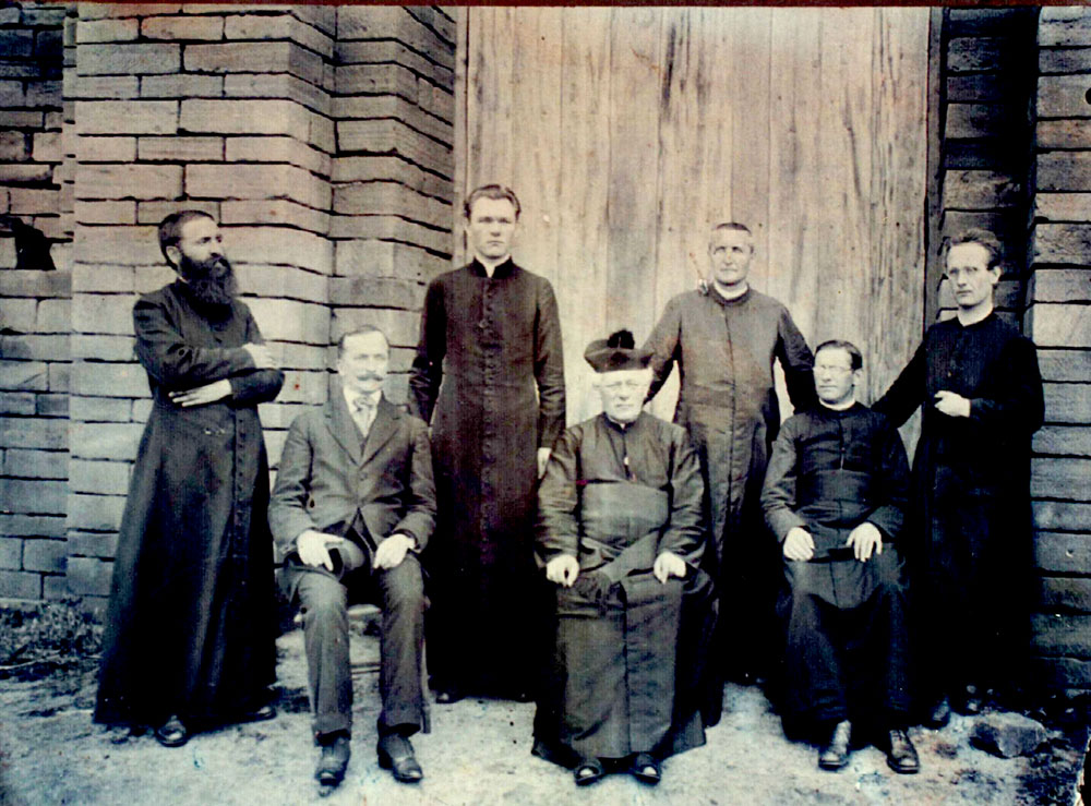 Sentados: el Conde José Bialostocki, administrador de la Colonia Agrícola de Apóstoles, el Superior de la Orden Verbita en visita pastoral a la feligresía de la colonia y el P. Marianski, párroco de la Colonia Agrícola de Azara.