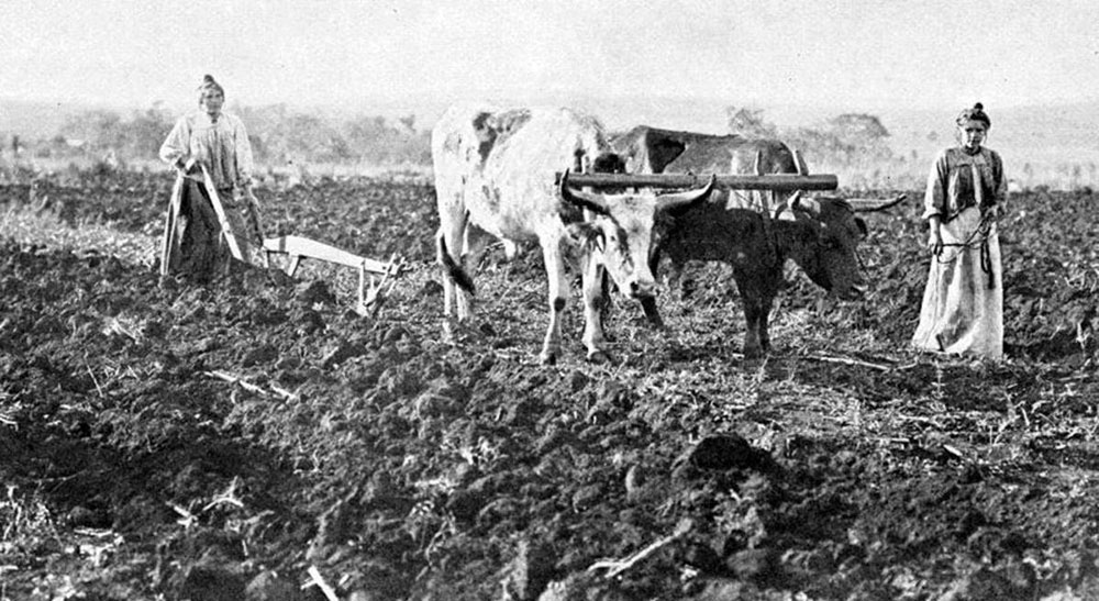 Arar la tierra. La foto fue tomada en la Colonia Agrícola de Apóstoles en el año 1898, quizás ante el asombro y el desconcierto del circunstancial fotógrafo al ver a dos mujeres, que parecerían ser madre e hija, llevando el arado y guiando a los bueyes, mientras la tierra se abría para recibir la simiente.