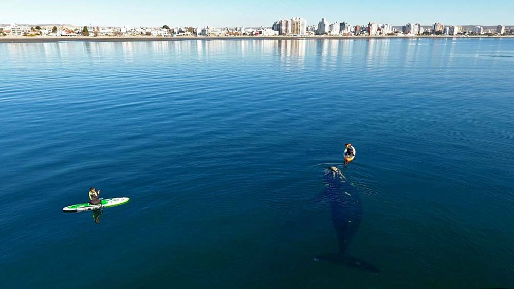 Analía vio cómo una de las ballenas se acercaba y de inmediato sacó el remo de agua. “Es lo que hay que hacer para no molestarlas y esperar que ellas pasen tranquilas”, contó a Télam.