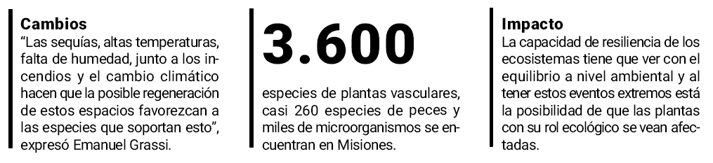 Manifestó que “las sequías, altas temperaturas, falta de humedad, junto a los incendios y el cambio climático a largo plazo hacen que la posible regeneración de estos espacios favorezcan a las especies que soportan esto y no tendremos el equilibrio en la selva paranaense al que estamos acostumbrados”.