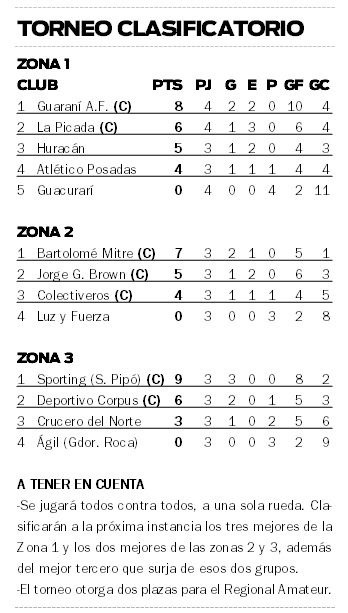 Por la zona B, en tanto, también hubo doble jornada en cancha de Sporting y en el encuentro que abrió la actividad, Candelaria superó por 2-0 a Garupaense; mientras que más tarde Tigre y Deportivo Roca igualaron 3-3.