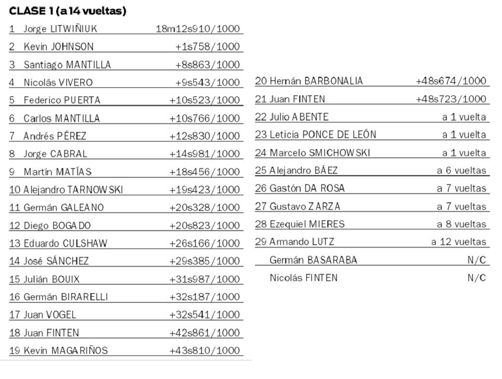 En cuanto a la Clase 1, la divisional volvió a entregar su show con 33 vehículos en pista. Y allí Jorge “El Polaquito” Litwiñiuk dominó desde el comienzo, aunque no sin transpirar el buzo, sobre todo por la presión que le pusieron desde atrás en las primeras vueltas tanto Julio Abente como Kevin Johnson y Santi Mantilla, actual líder del campeonato.