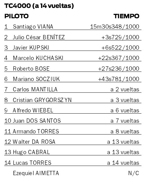 Para el final de la tarde quedó la definición del TC4000, la categoría más potente. Y allí Santiago Viana (Ford Falcon) largó de la mejor manera y tomó el liderazgo, aunque perseguido por Cristian Grygorszyn (Chevrolet 400), quien estuvo a punto de dar el zarpazo en varias oportunidades, pero se quedó a tres vueltas del cierre.