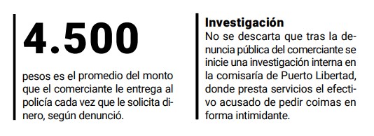 El denunciante precisó que en más de una ocasión le consultó al efectivo involucrado “si están tus jefes encima”, debido a la insistencia por cobrar y las amenazas. Consultado acerca de las sumas que entregó al uniformado cada vez que le solicitó dinero, el comerciante confió que “no es mucho, en algunas ocasiones le doy 3.500 pesos o en otras 4.500. No obstante, esto me ocasiona problemas porque tengo empleados que pagar y no es para nada fácil en esta época de pandemia”, lamentó.