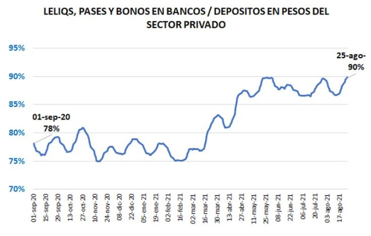 “El 90% de los depósitos en pesos del sector privado están colocados en instrumentos que emite el BCRA (62%) o el Tesoro (28%). Esta exposición creció fuertemente desde marzo de este año y se consolida en el rango que va del 85% al 90% donde fluctúa desde hace varios meses”, precisó.