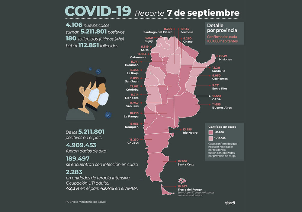 Otras 180 personas murieron y 4.106 fueron reportadas con coronavirus en las últimas 24 horas en la Argentina, con lo que suman 112.851 los fallecidos registrados oficialmente a nivel nacional y 5.211.801 los contagiados desde el inicio de la pandemia, informó este martes el Ministerio de Salud.