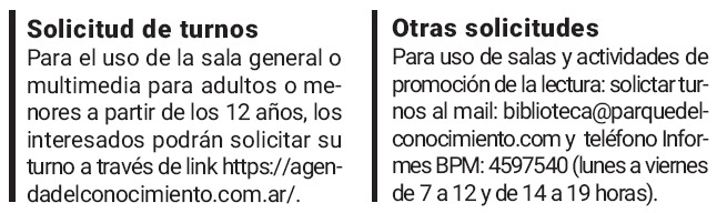 Los turnos se deberán solicitar a través de la página Facebook de la Biblioteca de las Misiones o el sitio del Parque del Conocimiento, donde el público “seguro ya ha pedido algún turno para el teatro o el observatorio; va a estar ahí la Biblioteca Pública de las Misiones, para estos dos espacios, los demás espacios como alguna actividad escolar, nos estamos manejando a través de un correo electrónico que también figura dentro del Facebook de la Biblioteca”, explicó su directora.
