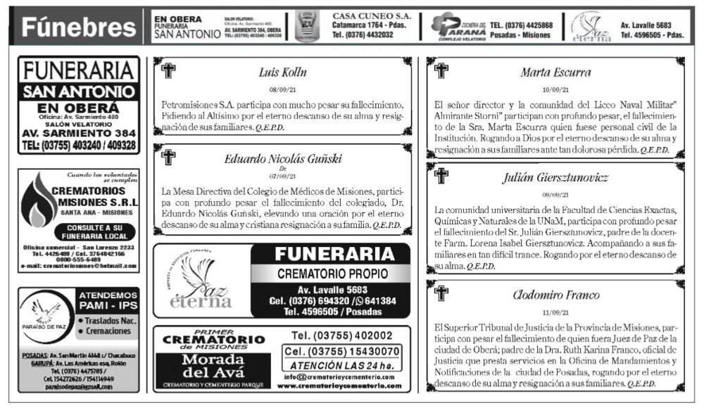 Fúnebres del domingo 12 de septiembre de 2021