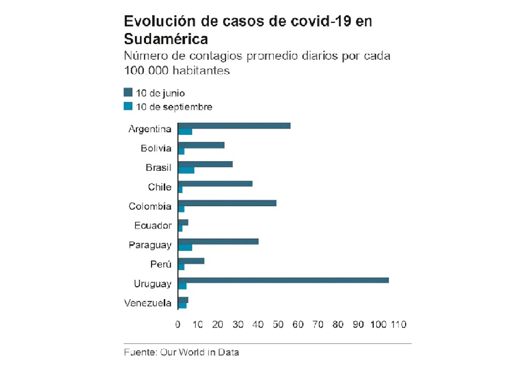Uruguay, que a inicios de junio llegó a tener 100 casos por cada 100.000 habitantes, ahora solamente tiene 4 contagios diarios por cada 100.000 habitantes.