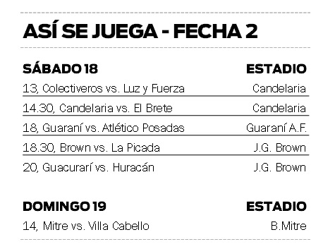En Candelaria habrá doble jornada con los encuentros que sostendrán Colectiveros vs. Luz y Fuerza y Candelaria vs. El Brete, a las 13 y 14.30, respectivamente; mientras que en Villa Urquiza, Brown recibirá a La Picada, a las 18.30; y Guacurarí chocará con Huracán, a las 20.