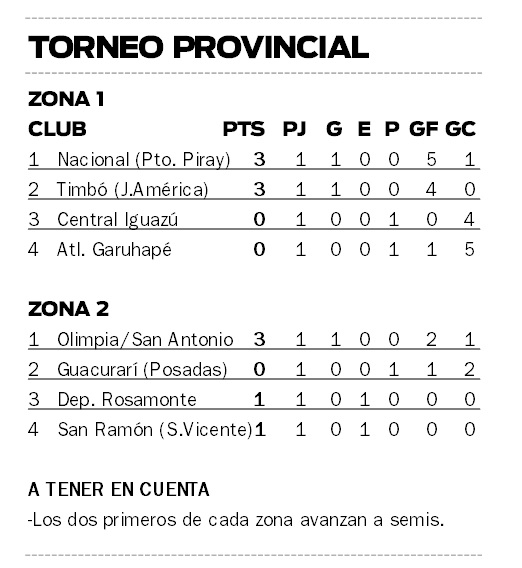 Tras el triunfo 2-1 de Olimpia San Antonio sobre Guacurarí, este domingo se completó la primera fecha del Torneo Provincial de la Federación Misionera de Fútbol, con tres encuentros en distintos puntos de la región.