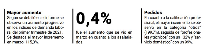 En consecuencia, se mencionó que en el primer trimestre de 2021, la única categoría profesional con una caída interanual en su demanda laboral fue la de “operativos industriales” (-75,0%). Mientras que el mayor incremento se observa en la categoría “otros” (199,7%), seguida de “profesionales y técnicos” con un 132,0% y “servicio doméstico” con un 99%.
