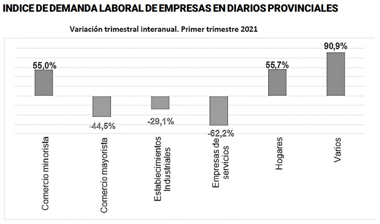 Con respecto a las variaciones negativas, las “empresas de servicios” disminuyeron su demanda laboral en un 62,2%; en tanto el “comercio mayorista” un 44,5% y los “establecimientos industriales” un 29,1%.