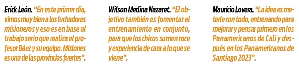 La planificación semanal del campus incluye trabajo en doble turno todos los días hasta el sábado. “El objetivo también es fomentar el entrenamiento en conjunto, para que los chicos sumen roce y experiencia”, recalcó a este Suple el colombiano Wilson Medina Nazaret (38), entrenador nacional en Juveniles, quien no dejó de subrayar las cualidades de Mauri Lovera: “tiene cualidades físicas, fuerza y resistencia. Vamos a trabajar para que pueda atacar constantemente, porque su categoría, lucha libre hasta 65 kilos, es una de las más difíciles, pero la chance de podio siempre está”.