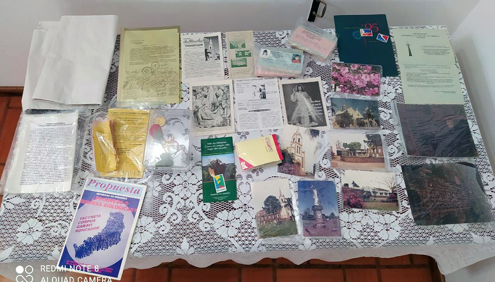 “Se habían constituido numerosas subcomisiones de trabajo y cada una de ellas tenía a su cargo los preparativos de una instancia de los extensos programas de actos. Como parte de dicha ceremonia se realizó la suelta de palomas y de un rosario con globos de dimensiones gigantes, cuyas cuentas eran esferas de telgopor, confeccionado por don Juan y doña Elena Zuk, que en minutos se perdió en el cielo fruto del fuerte viento que soplaba en ese día de intenso calor. Dice María Mabel Edith Cheroki de González, docente apostoleña en su Pequeña Historia de un Acto de Fe: ‘A la semana tuvimos noticias del rosario, había caído en una chacra en San José, propiedad de don Honorio Spaciuk. ¿Qué sucedió? Las chacras vecinas se habían incendiado (para esos días es común la quema de campos para que venga una buena brotación de pastos después de las heladas), los bomberos de Apóstoles y la policía de San José acudieron a sofocar el fuego y observaron sobre unas malezas algo colgado, con cuidado se acercan y vieron con estupor que el Rosario que se había soltado en Apóstoles, estaba allí, intacto, mientras todo ardía alrededor’”.