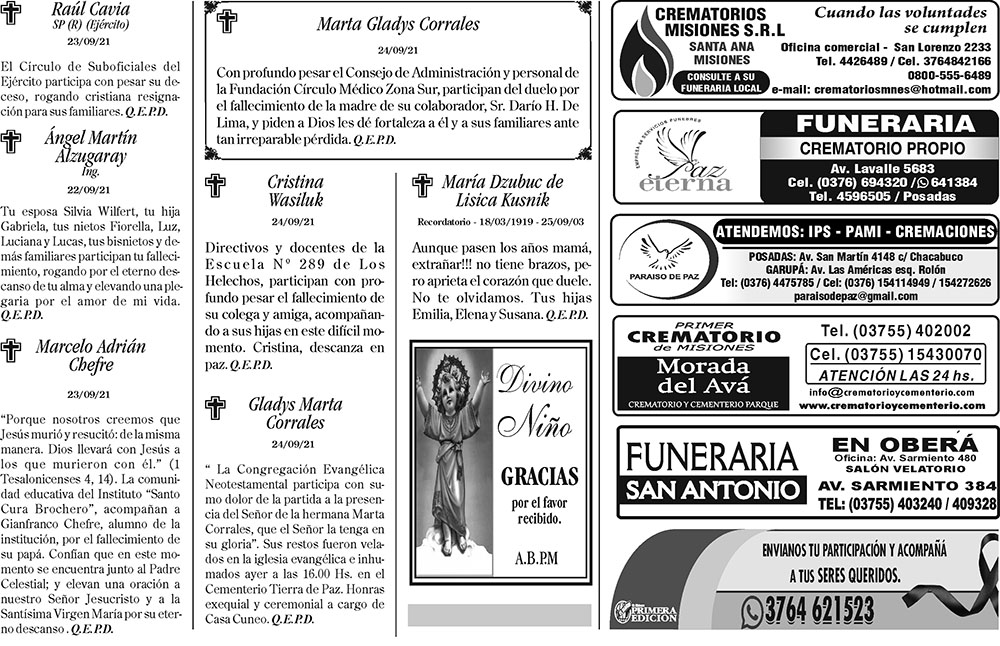 Fúnebres del Sábado 25 de Septiembre de 2021
