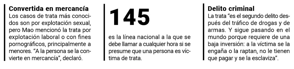 Mao definió a la trata como “el rapto de una persona a través del engaño o en contra de su voluntad”. Los engaños más comunes suelen ser con oportunidades laborales, por lo que “las personas más afectadas suelen pertenecer a los sectores vulnerables por falta de oportunidades. Confían en que van a poder ayudar con la economía de su familia y se van”, explicó.