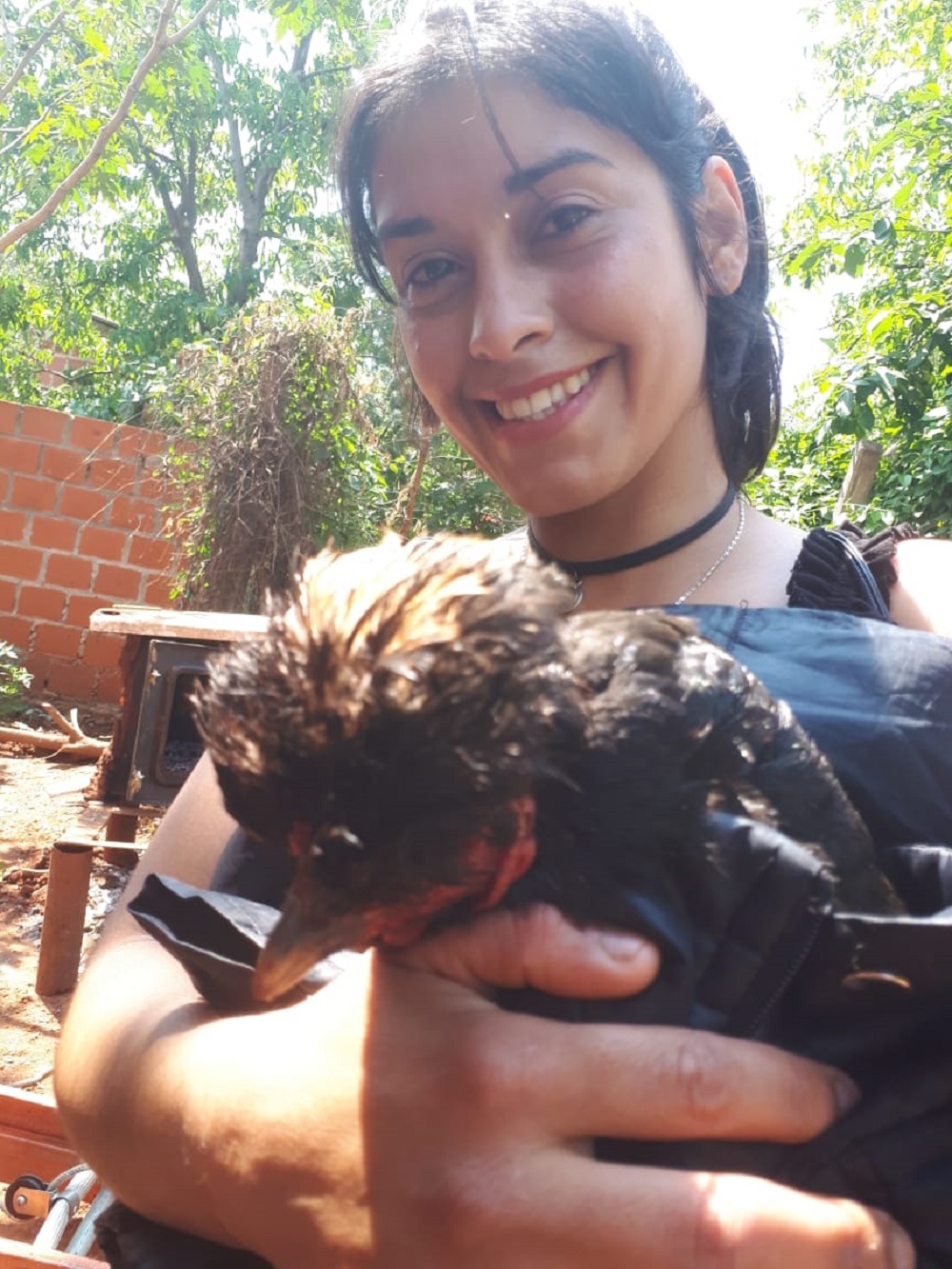 Se trata de un pollo que la hija de la propietaria tiene como su mascota, durmiendo y paseando siempre con ella.
