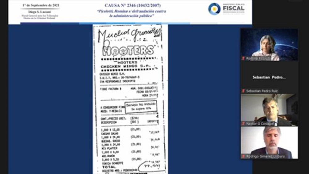 En su alegato expuso las facturas de varios de ellos. Uno de los tickets que expuso fue uno de los gastos que más llamó la atención. Es de 77,50 pesos en “Hooters”, un bar que era atendido por mujeres semidesnudas y lleva escrito un “Muchas gracias”. Otro gasto, en el local Pigmento, dice “regalo Flor y Sofi de cumpleaños”.