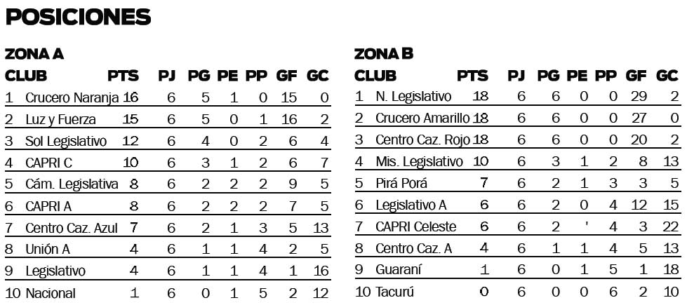 Legislativo A, por su parte, goleó 4-0 a CAPRI Celeste con goles de Alejandra Ibarra, Beatriz Mercado y dos de Andrea Quiroz, y está sexto con seis puntos. En el último partido de la zona, Centro de Cazadores A y Guaraní no se sacaron ventajas y empataron 0-0.