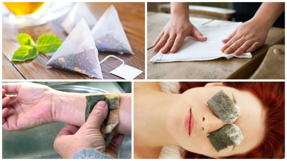 Los taninos del té han sido probados para disminuir la hinchazón y las ojeras. Las bolsitas usadas se pueden poner en el refrigerador o dejarlas enfriar por media hora, luego se pone sobre los ojos por 10 a 15 minutos. Las bolsas sin cafeína (por ejemplo, las de manzanilla) también ayudan a reducir la inflamación. Las bolsitas de té verde además de cafeína contienen ECGC (otro antiinflamatorio). De acuerdo con la dermatóloga Andrea Kunin, el té verde ayuda a disminuir la hinchazón y los círculos oscuros debajo de los ojos. Además, el té verde tiene antioxidantes.