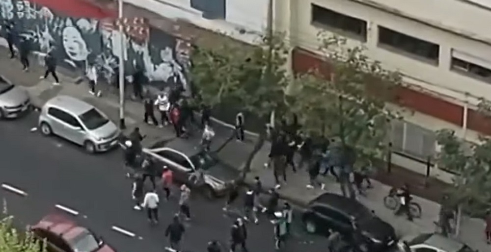 Algunos de los sujetos, en su corrida, rompieron autos que estaban estacionados por la avenida Belgrano, e incluso saltaron sobre el capot y el techo de un rodado.