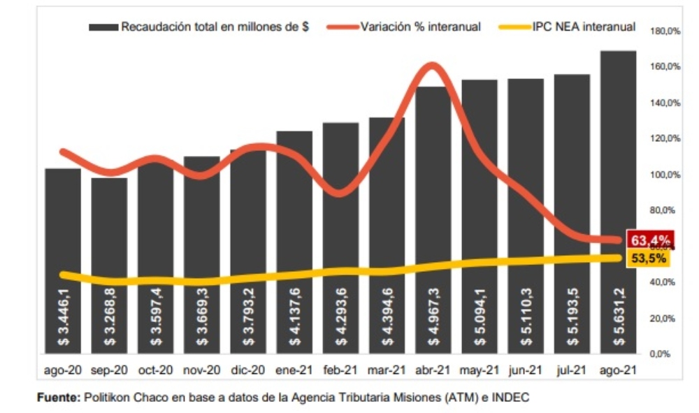 De este modo, Misiones cierra el período enero – agosto del 2021 con una recaudación total de $38.822,2 millones: 96,1% más que en igual período del 2020 a pesos corrientes.