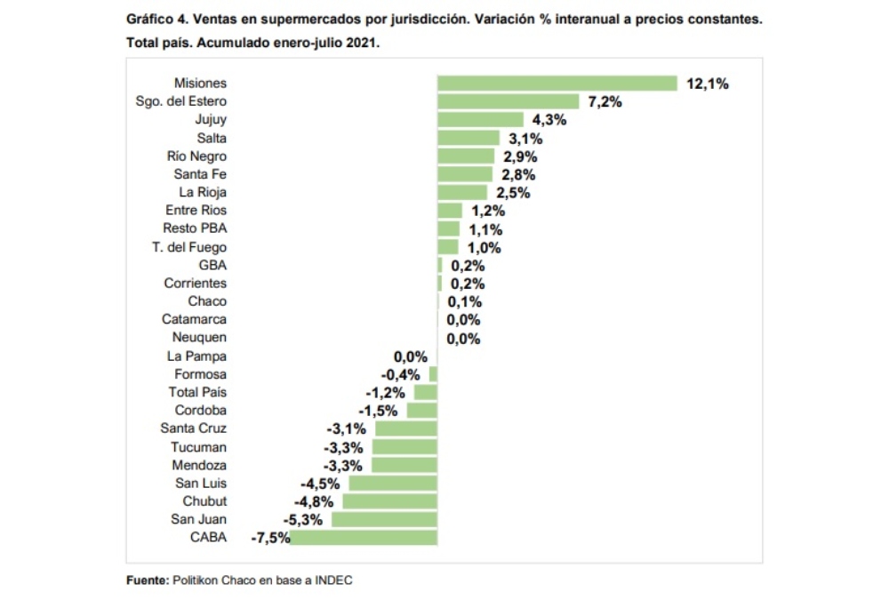 En julio de 2021, la provincia de Misiones tuvo, por quinto mes consecutivo, un importante incremento en las ventas reales de supermercados, siendo a su vez la cuarta más alta de todo el país.
