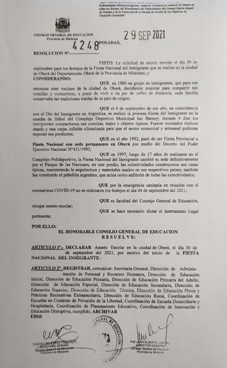 El Consejo General de Educación (CGE) estableció hoy asueto escolar para este jueves 30 en las escuelas de todos los niveles de Oberá por el inicio de la Fiesta Nacional del Inmigrante.