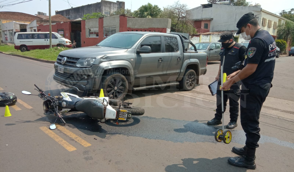 El hecho ocurrió este jueves en horas del mediodía en la esquina de avenida Monteagudo y calle Yerbal de esta ciudad. En ese lugar, una motocicleta 150 cc. impactó contra una camioneta Volkswagen Amarok, según las primera informaciones.