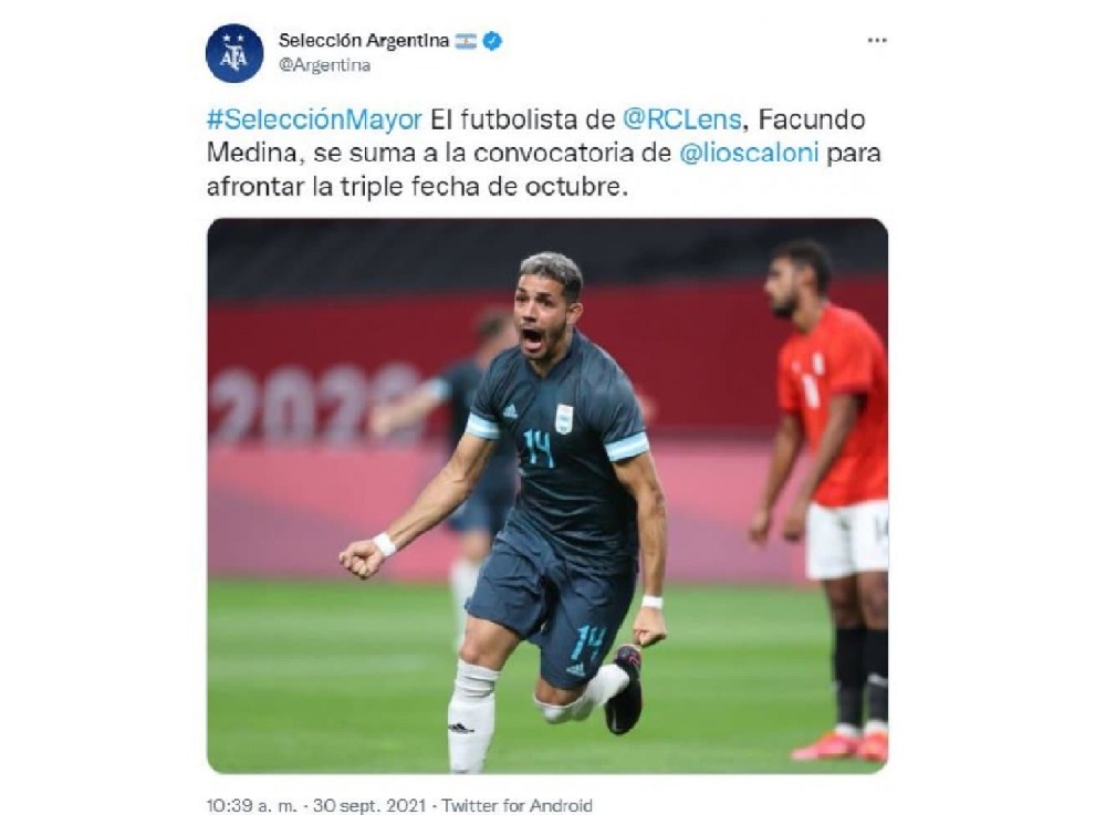 Medina, de 22 años y actual jugador del Lens de la Ligue 1 de Francia, ya había sido convocado por Lionel Scaloni para los primeros partidos de las Eliminatorias y sumó un puñado de minutos en cancha en la victoria contra Bolivia en La Paz. Además participó con Argentina en los Juegos Olímpicos de Tokio.
