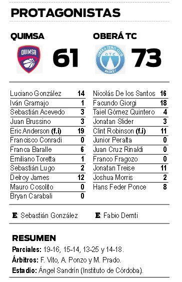 Tardó cuatro partidos en acomodarse, pero Oberá Tenis Club finalmente despertó en el Súper 20 de la Liga Nacional de Básquetbol. Superó a Quimsa de Santiago del Estero, el último finalista del certamen, por 73-61 y ahora se muda de Córdoba a Corrientes.