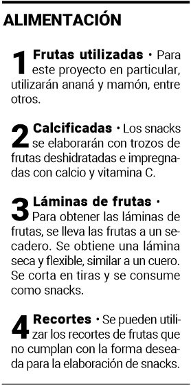 La propuesta es elaborar snacks de ananá deshidratados y láminas de frutas (fruit leather) a base de moras y mamón, con agregado de calcio y vitamina C. Los productos se distribuirán a los comedores universitarios a los que asisten los estudiantes de la FCEQyN.
