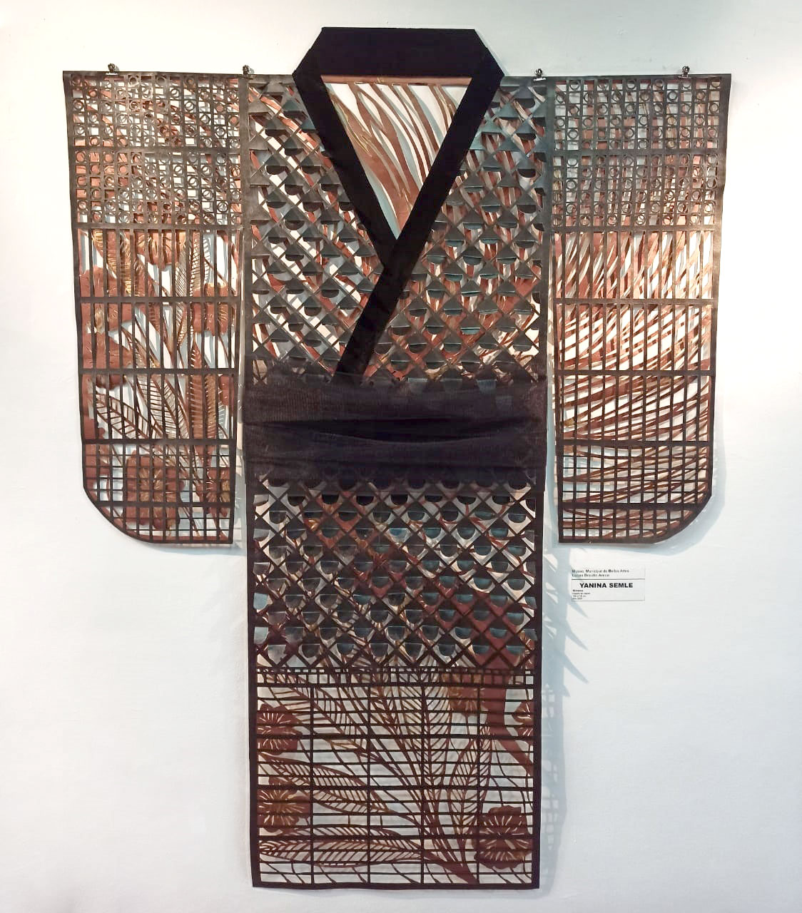 Se exponen kimonos que surgieron de una inspiración anterior, cuenta que “en algún momento era un encargo de Buenos Aires y se me cayó la idea de hacerlo en metal y terminó siendo en papel, al final hice otra para el cliente”. Las salas se convierten por momentos en un gran escenario japonés, con kimonos y un jimbaori (abrigo que usaban los samurai de alto rango arriba de sus armaduras).