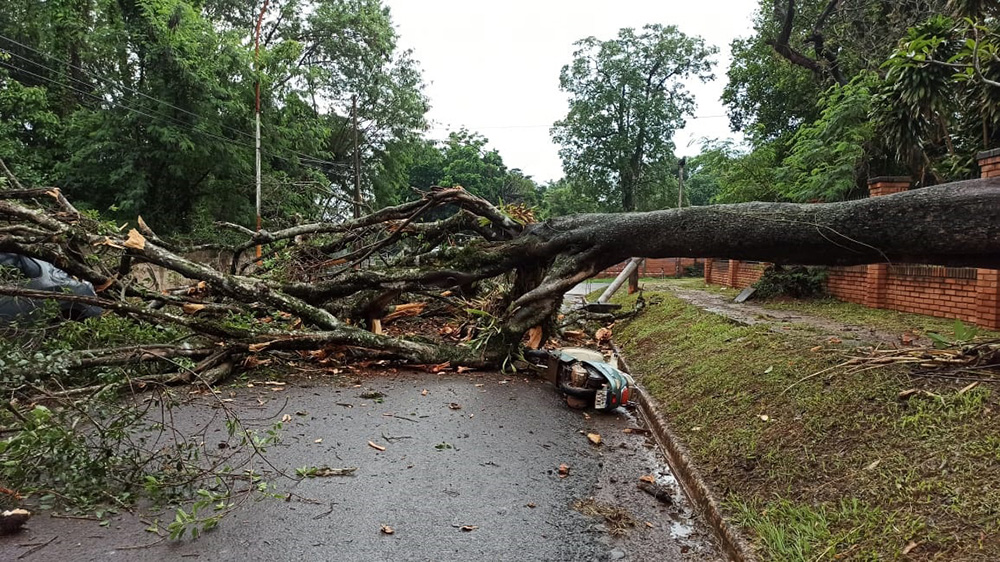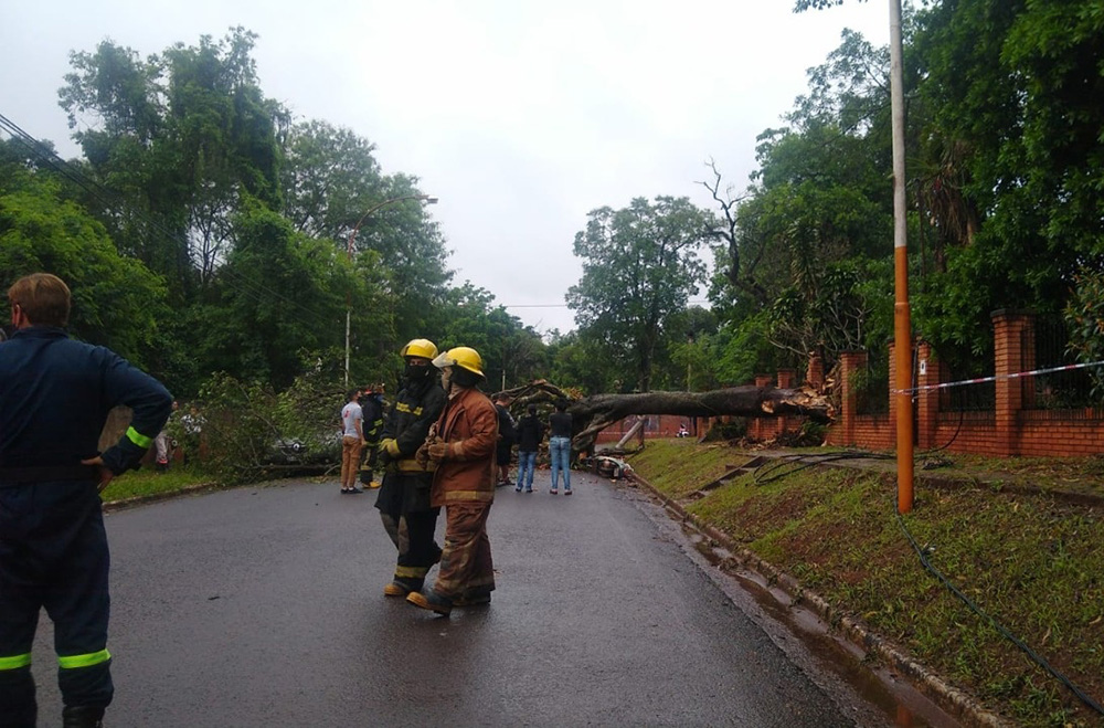 En la mañana de este sábado, un árbol cayó sobre un auto y motocicleta en la calle Alvar Nuñez, en Barrio Centro de Puerto Iguazú.