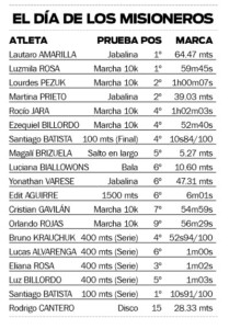 Misiones llevó una numerosa delegación de 23 atletas y el primer día tuvo una buena cosecha de podios. En el Polideportivo Jaime Zapata, el posadeño Lautaro Amarilla (19) se consagró campeón en lanzamiento de jabalina y Luzmila Rosa (17) de Eldorado, se colgó la medalla de oro en Marcha 10k.