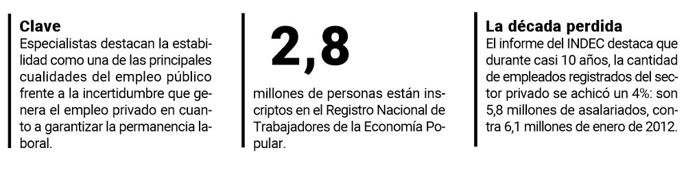 El empleo privado cayó 4% en la última década mientras que el estatal aumentó 29%, lo que indica que por cada puesto perdido se crearon tres en la esfera pública en el período 2012-2021, según datos oficiales.