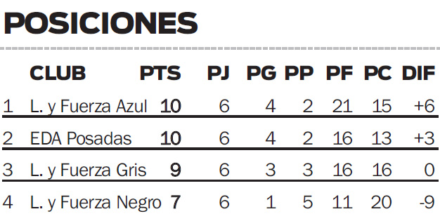 Con estos resultados, Luz y Fuerza Azul y EDA Posadas siguen como líderes, con 10 puntos cada uno. Luz y Fuerza Gris quedó tercero, con nueve unidades, y cierra la tabla el equipo Negro con siete puntos. Fecha y sede de la tercera jornada del Circuito se definirán en las próximas horas.