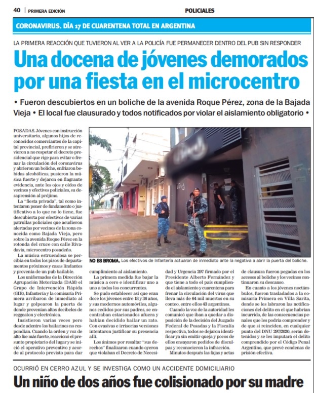 La repercusión mediática del procedimiento policial, realizado durante la madrugada del sábado 4 de abril de 2020 en el boliche del barrio Bajada Vieja de Posadas, tuvo alcance nacional cuando sólo habían transcurrido dos semanas de la vigencia del decreto 297 firmado por el presidente Alberto Fernández que imponía el aislamiento total y la prohibición de todo tipo de celebraciones o reuniones. La excusa de los infractores ante los primeros policías que arribaron al local fue: “Esto es una fiesta privada”, precisamente lo que no debía ocurrir.