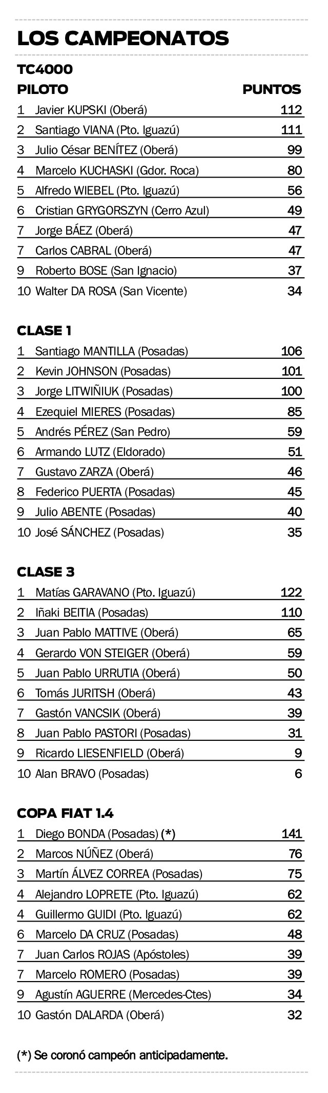 En ese marco, una de las divisionales que promete show es la Clase 1, la de mayor parque, que para la oportunidad tendrá ni más ni menos que 35 inscriptos. El líder del campeonato allí es Santiago Mantilla, aunque apenas cinco puntos por encima de Kevin Johnson y seis del legendario Jorge “Polaquito” Litwiñiuk.
