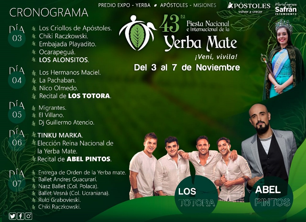 De esta manera, se comienza a palpitar uno de los eventos anuales más importantes para Apóstoles y Misiones, donde se podrá disfrutar de la mejor gastronomía, maquinarias, expositores, jornadas agrotecnológicas y artistas de primer nivel, entre ellos Abel Pintos, Nicolas Olmedo, Los Totora, Los Alonsitos, El Villano, Migrantes y Dj Atencio, entre otros variados músicos de excelente nivel del sector local y regional.