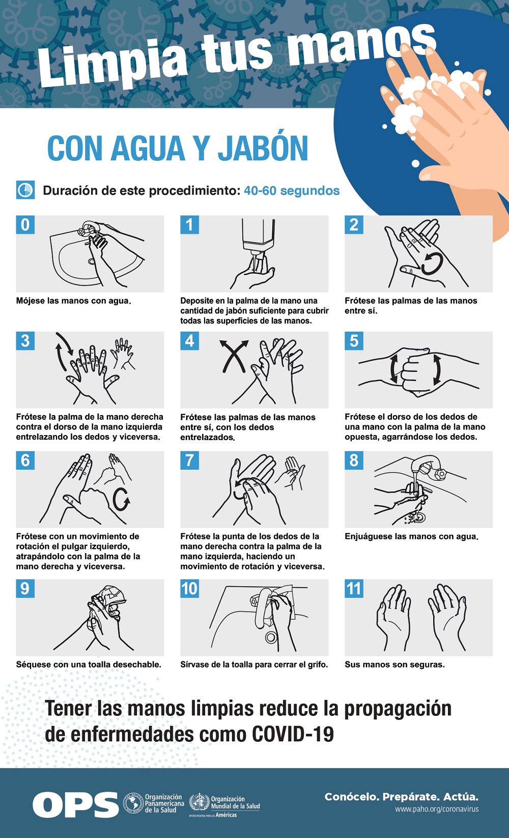 • Lavarse las manos solamente con agua no es suficiente, es significativamente menos efectivo que hacerlo con jabón, ya que, usándolo facilita la frotación, lo que permite disolver la grasa y eliminar la suciedad que contienen la mayoría de los gérmenes. Si se usan adecuadamente, todos los jabones son igualmente efectivos para remover los gérmenes que causan enfermedades. Las manos húmedas se deben cubrir con jabón y frotar toda la superficie, incluidas las palmas, el dorso, entre los dedos y especialmente debajo de las uñas, por lo menos 20 segundos. Luego, se deben enjuagar bien y secarlas, ya sea con una tela limpia o agitando las manos. Una manera fácil de calcular los 20 segundos es encontrar una canción familiar que tome ese tiempo para cantarla, por ejemplo, toma cerca de 20 segundos cantar dos veces la canción del “feliz cumpleaños”.
