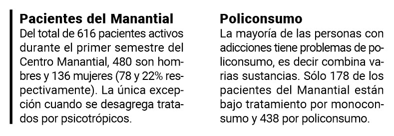 Esta demora también se observa en la estadística: la edad promedio de atención de pacientes con adicciones es de 33 años en hombres y de 36,5 años en mujeres, “el varón llega al consultorio antes que las mujeres, paradójicamente impulsado por una mujer de su entorno”, reflexionó. Según destacó López, “difícilmente una persona con adicciones pida ayuda para sí misma, generalmente es su familia la que consulta”.