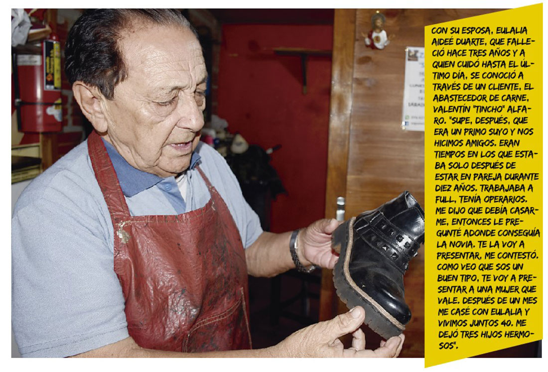 Durante su vida fue zapatero, comerciante, de todo un poco, “siempre que fue para vivir y salir adelante, hice las cosas honradamente. La zapatería fue bajando cuando empezaron a entrar cosas de Brasil, y se fue terminando el cuero. Hoy plantillas de cuero no se hacen más. Nosotros hacíamos laburo, laburo, cortando con trinchetas, metiendo clavos. Ahora hacer un zapato es una pavada. Comprás la plantilla, la armas, la coses y listo. Si la suela no era prensada, había que golpear. Antes significaba trabajo, hoy la zapatería o la compostura es un trabajín. Hoy viene todo cortado, viene todo hecho, hay que ensamblar nomas. Es todo más fácil”, comparó, quien utiliza anteojos “sólo para detalles o cuestiones mínimas”.