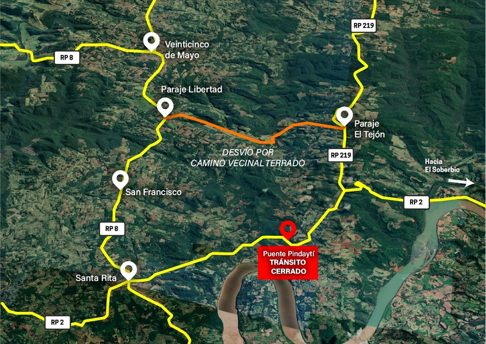 Luego de la suba del cauce del arroyo Pindaytí, por la que se determinó el corte total del paso vehicular y peatonal sobre el puente provisorio de la ruta 2, se adecuó un desvío que se encuentra apto para circular con todo tipo de vehículos.