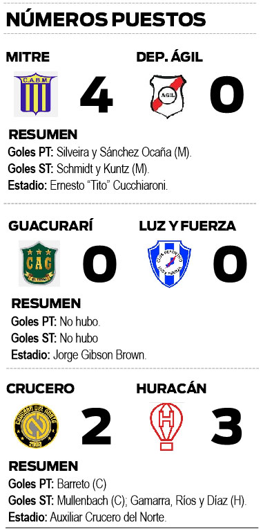 A su vez, en Santa Inés, Huracán levantó un 2-0 y terminó derrotando por 3-2 al dueño de casa Crucero del Norte.